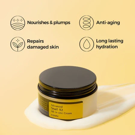 COSRX Advanced Snail 92 All In One Cream is a lightweight and non-greasy moisturizing cream that is highly effective at hydrating and soothing damaged or irritated skin. The highly-concentrated cream contains 92% nutritious, low-stimulation filtered snail mucin. Snail mucin gives skin a natural glow from within, while also providing benefits such as fading dark spots, improving skin texture/ fine lines, and is anti-aging. Additional key ingredients include sodium hyaluronate, allantoin, panthenol, and arginine, all of which are excellent for hydrating skin and enhancing elasticity. This product is ideal for those with dull & rough skin, dry or dehydrated skin, red and irritated skin, or for those with dark spots and scars (such as from acne). It is also suitable for oily skin and sensitive skin!